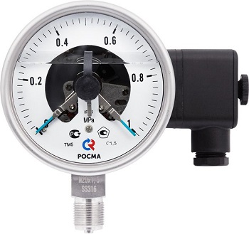 Манометр ТМ-521.05 (Мановакуумметр ТМВ-521.05, Вакуумметр ТВ-521.05) с электроконтактной приставкой в радиальном исполнении и диаметром корпуса 100 мм от ЗАО «РОСМА» относится к промышленным манометрам и применяется для измерения избыточного и/или вакуумметрического давления агрессивных сред. Электроконтактная приставка обеспечивает управление внешними электрическими цепями в схемах сигнализации, автоматики и блокировки процессов с повышенной вибрацией. Максимальная температура измеряемой среды будет зависть от заполнения прибора: без заполнения - до 200°C; с силиконом - до 100°C. Данный прибор снабжен указателем для настройки пороговых значений, настройка осуществляется с помощью специального ключа (идет в комплекте с прибором). Промышленные электроконтактные манометры представлены с одноконтактной и двухконтактной электрической схемой: Одноконтактная Исп. I (.01) ОЗ–ТМ и ТМВ, ОР–ТВ / Исп. II (.02) ОЗ–ТВ и ТМВ, ОР–ТМ; Двухконтактная Исп. V (.05) ЛРПЗ–ТМ, ПРЛЗ–ТВ, ЛЗПЗ–ТМВ. Другие Исп. под заказ.